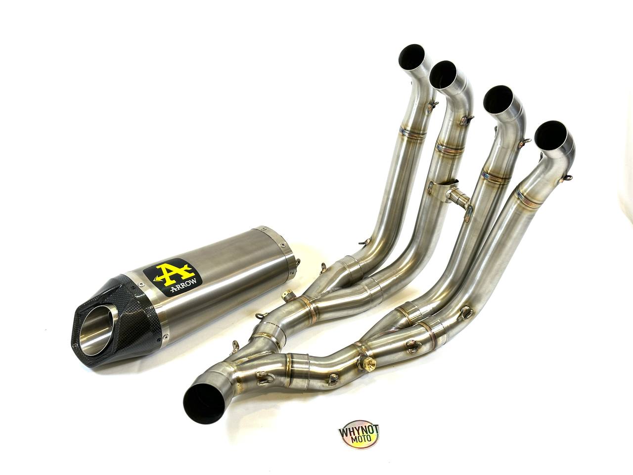 Выхлопная система Arrow 71141CKZ состоит из титановой банки глушителя и стальных коллекторов.