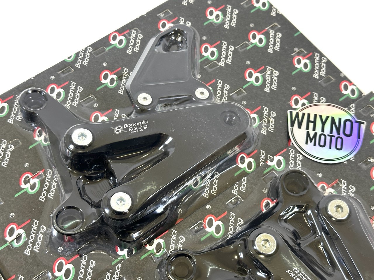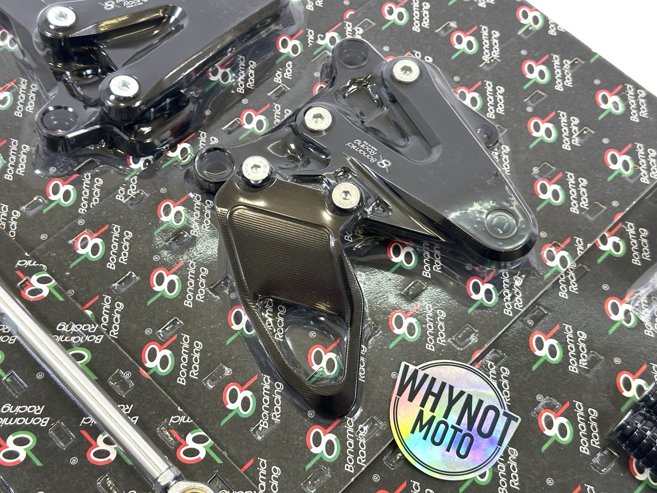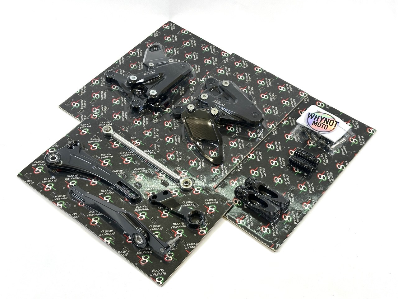 Педальный узел Bonamici Racing поставляется с черным анодированным покрытием, алюминиевыми защитными накладками на пятки, фиксированными рифлеными подножками и фиксированными подножками с резиновым покрытием.