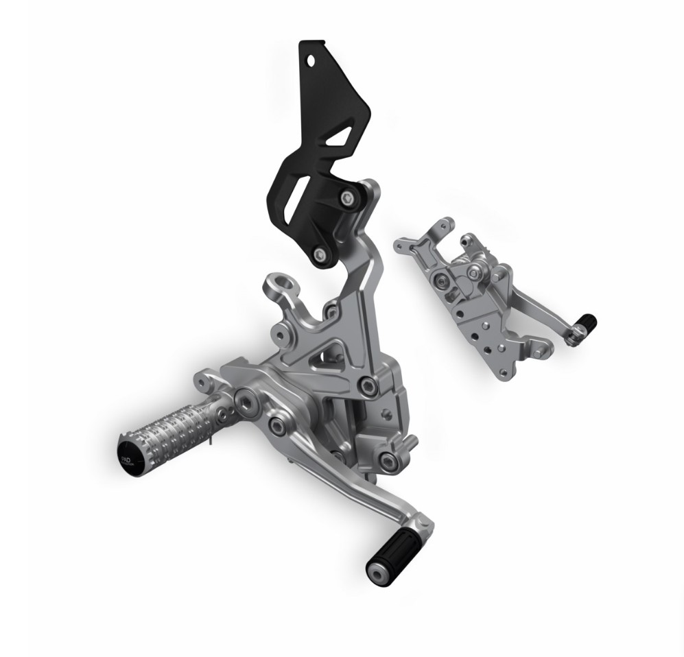 Накопленный за годы работы опыт Ducati Corse и мастерство Rizoma в изготовлении компонентов высшего качества легли в основу этих подножек. Изготовленные из высококачественного анодированного алюминиевого сплава, который со временем сохраняет свой первоначальный вид, они позволяют гонщику выбрать положение, наиболее соответствующее его телосложению и стилю езды. Шарнирные педали тормоза и передачи сводят к минимуму риск поломки в случае падения. Благодаря трем регулировочным уровням их можно сконфигурировать как для традиционной, так и перевернутой КПП (гоночный вариант). Незаменимый аксессуар для самых взыскательных гонщиков, которым важно в полной мере наслаждаться ездой.